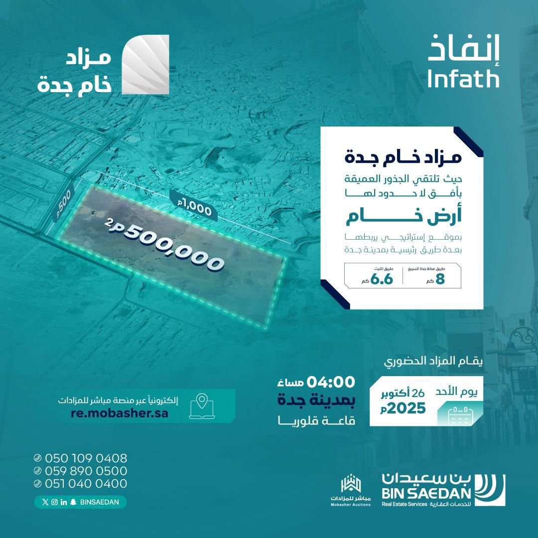 يأتي هذا المزاد تحت الإشراف المباشر لمركز الإسناد والتصفية “إنفاذ” وبناءً على قرار صادر من محكمة التنفيذ.
