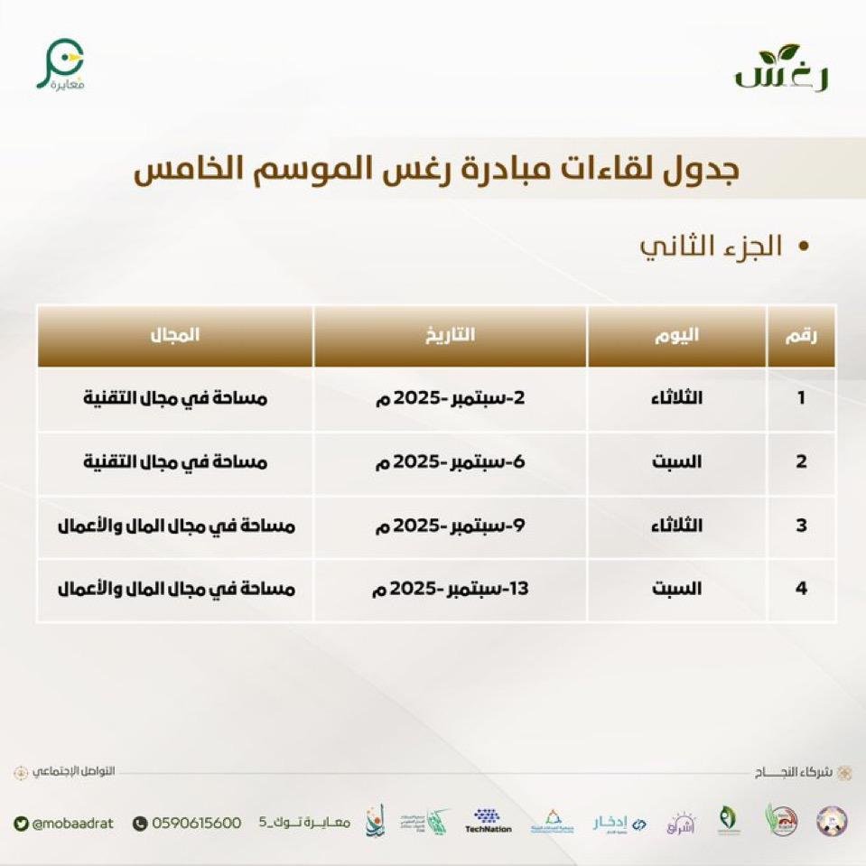 تنطلق في الثاني من سبتمبر الجاري فعاليات الجزء الثاني من مبادرة “رغَس” في موسمها الخامس، تحت شعار “حيث يبدأ التميز ويُجنى الحصاد”، وذلك استمرارًا لمسيرة المبادرة في تمكين الشباب وتعزيز روح العطاء والإبداع.