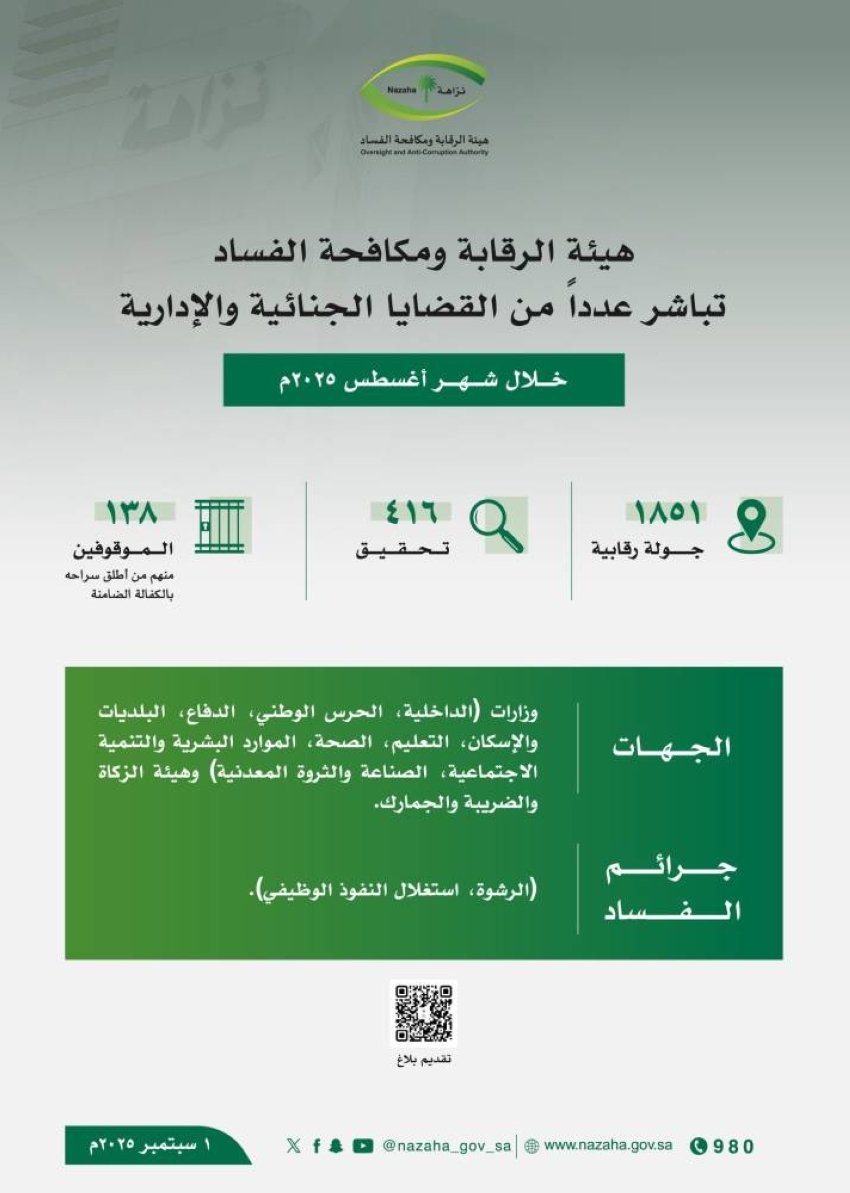 باشرت هيئة الرقابة ومكافحة الفساد “نزاهة” 1851 جولة رقابية خلال شهر أغسطس المنصرم؛ أسفرت عن التحقيق مع 416 مشتبهاً بهم، وتوقيف 138، منهم من أُطلق سراحه بالكفالة الضامنة.